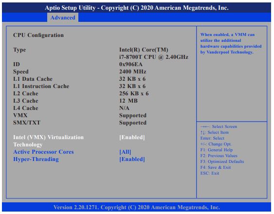 Intel® (VMX) Virtualization Technology Enables or disables Intel Virtualization technology. Active Processors Cores Select the number of cores to enable in each processor package. Hyper-Threading Enables or disables hyper-threading technology.