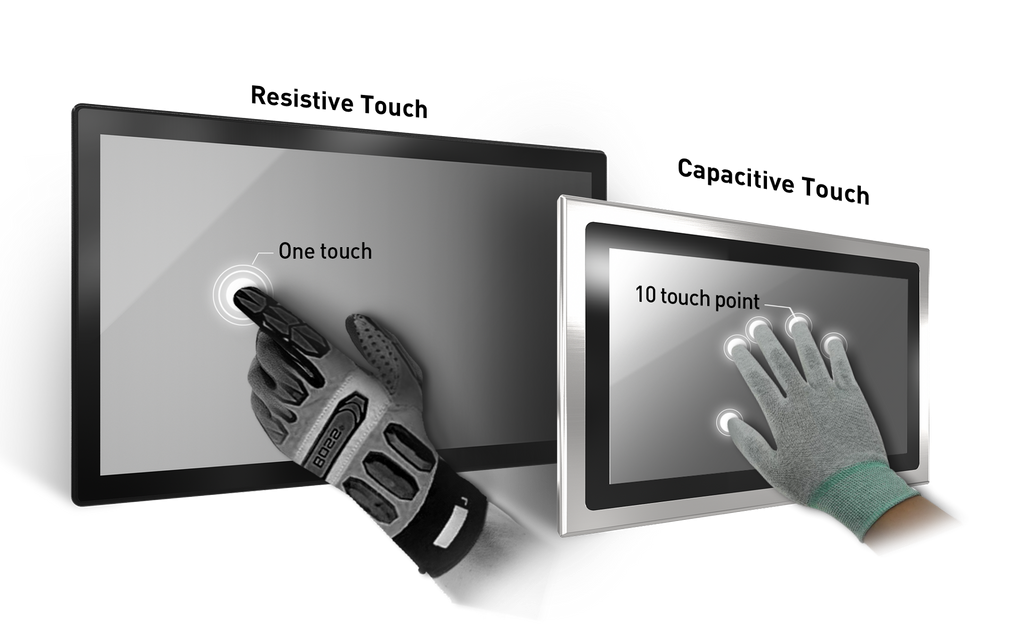 Màn hình hiển thị màn hình cảm ứng điện dung sử dụng độ dẫn điện thay vì áp suất để phát hiện đầu vào. Màn hình cảm ứng điện dung cảm nhận các đặc tính dẫn điện, chẳng hạn như đầu ngón tay hoặc găng tay dẫn điện. Sử dụng độ dẫn điện để phát hiện cảm ứng giúp tăng khả năng phản hồi và độ nhạy, cho phép đăng ký tối đa 10 điểm chạm và cử chỉ, do đó cung cấp nhiều tùy chọn hơn cho người dùng dựa trên các ứng dụng công nghiệp khác nhau, như thu phóng, chụm hoặc cảm ứng đa điểm. Màn hình cảm ứng điện dung đã được sử dụng rộng rãi trong các triển khai công nghiệp, chẳng hạn như ki-ốt và bán lẻ, trong đó nó yêu cầu màn hình cảm ứng có độ nhạy cao để có trải nghiệm người dùng cuối tốt hơn.