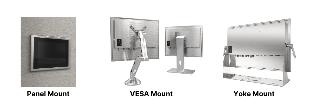 Màn hình LCD công nghiệp có nhiều tùy chọn lắp đặt khác nhau để phù hợp nhất với các ứng dụng công nghiệp khác nhau. Các tùy chọn lắp đặt cho phép màn hình hiển thị hoạt động ở các vị trí và cách sắp xếp khác nhau, tăng tính linh hoạt, mềm dẻo và công thái học trong quá trình triển khai. Do đó, các tùy chọn lắp đặt khác nhau là gắn bảng điều khiển, gắn kết VESA và màn hình LCD gắn kết Yoke.