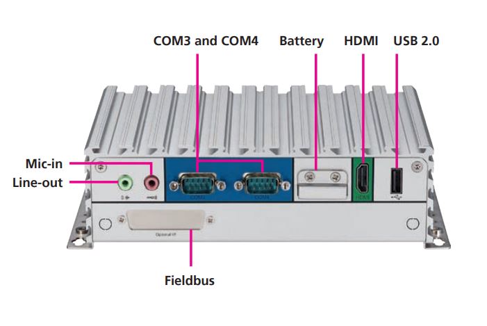 1 x USB2.0 1 x HDMI 1 x RTC Battery 2 x DB9 for COM3 & COM4, both support RS232/422/485 with auto flow control 1 x Mic-in & 1 x Line-out 2 x Antenna Holes for optional Wi-Fi/3.5G antenna 1 x Optional I/F for optional mini-PCIe Wi-Fi/3.5G modules |