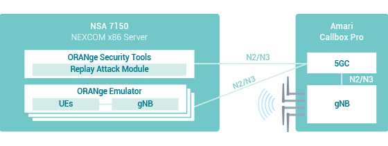 Để minh họa năng lực và khả năng bảo mật của NSA 7150, đã có 2 bài kiểm tra chạy đồng thời: bài kiểm tra SCAS (Đặc điểm đảm bảo an toàn) và bài kiểm tra năng lực UE mạng 5GC. Cả hai thử nghiệm đều được thực hiện với ORANge - Trình mô phỏng mạng truy cập vô tuyến thế hệ tiếp theo của O’Prueba, Công ty Nghiên cứu và Dịch vụ (RSC) đầu tiên từ Đại học Quốc gia Chiao Tung (NCTU) ở Đài Loan, là một phụ kiện của Phòng thí nghiệm đo điểm chuẩn mạng NCTU. ORANge đã cung cấp các tình huống thử nghiệm khác nhau nhằm giải quyết các vấn đề thử nghiệm theo nhu cầu của người dùng. Cấu trúc liên kết chi tiết được hiển thị trên Hình 2.