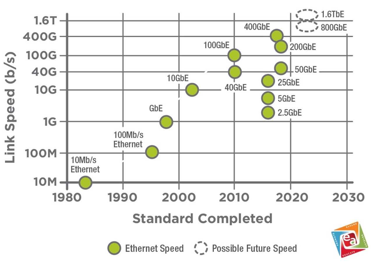 Hình 1. Xu hướng tốc độ Ethernet đang tăng lên theo cấp số nhân, với tốc độ 400 GB/s đang tăng dần