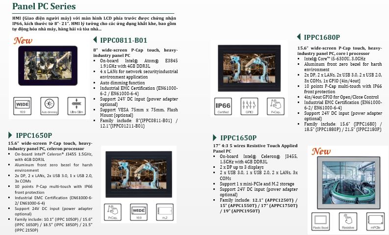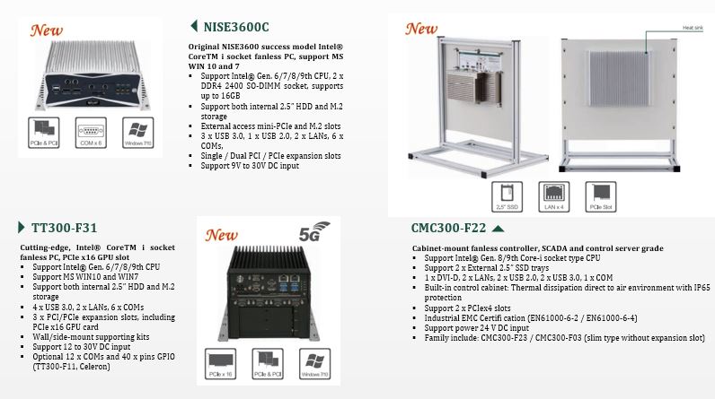 IPC của NEXCOM bao gồm máy tính không quạt (NISE), bộ điều khiển công nghiệp (NIFE) và Panel PC màn hình cảm ứng (IPPC/APPC/Transportation PPC/Marine PPC). Tất cả đều được trang bị công nghệ CPU mới nhất của Intel để đáp ứng nhu cầu của sản xuất thông minh.