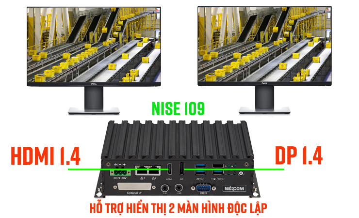 Với NISE109, lý do ban đầu của việc loại bỏ VGA là để ưu tiên cả HDMI và DisplayPort, giao diện hiển thị kỹ thuật số dành cho thế hệ màn hình mới. HDMI có thể được biết đến rộng rãi hơn, nhưng DisplayPort, thường được quảng cáo là tùy chọn "chơi game" cho PC thông thường, cung cấp băng thông cao hơn với DisplayPort 1.4 hỗ trợ 8K lên đến 60Hz, vượt quá 4K @ 30Hz của giao diện HDMI 1.4. NISE 109 đi kèm với DisplayPort 1.4 và cổng HDMI 1.4 . Sự kết hợp này mang lại khả năng tương thích rộng rãi của HDMI, nhưng cũng mở ra cánh cửa cho một loạt các khả năng khác nhau có sẵn thông qua DisplayPort, phục vụ cho một bộ phận ngày càng tăng của các nhà tích hợp và nhà khai thác đang phát triển ứng dụng. Cuối cùng, để phù hợp với các giao diện hiển thị hiện đại, NISE109 có một đầu nối LVDS bên trong có thể gắn vào một màn hình để tạo ra Panel PC mạnh mẽ.