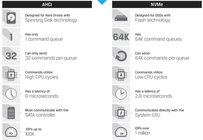 Tốc độ vượt trội: NVMe bắt đầu gửi lệnh nhanh hơn gấp 2 lần so với trình điều khiển AHCI. Hoạt động Đầu vào/Đầu ra NVMe mỗi giây vượt quá 1 triệu và nhanh hơn tới 900% so với AHCI tương đương của nó.