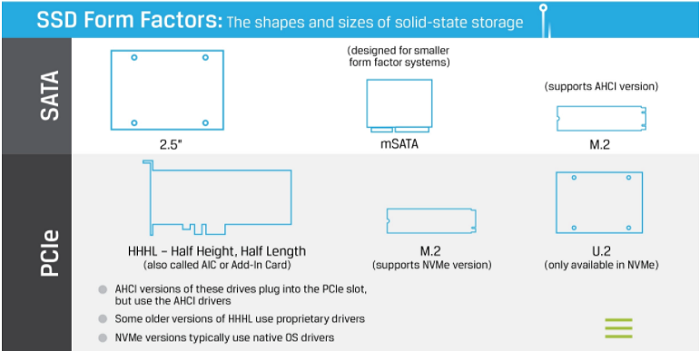 Công nghệ NVMe có ở một số dạng như khe cắm card PCIe, M.2 và U.2. Mặc dù có những ổ SSD sử dụng khe cắm SATA, PCIe và M.2 là AHCI chứ không phải NVMe, U.2 là form factor chỉ sử dụng giao thức NVMe.